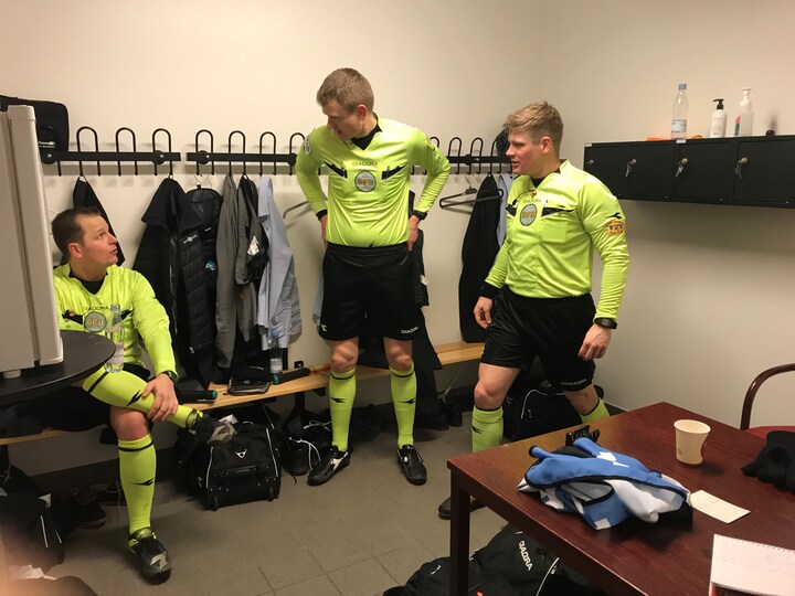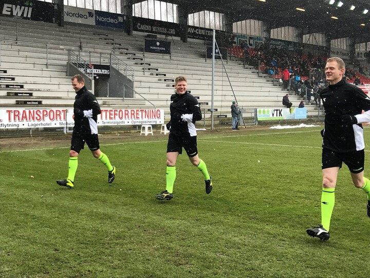 Dommer, udvikler, fjerdedommer og de to linjedommere mødes i dommeromklædningsrummet til en uformel snak om alt fra Vejle Boldklubs træners karantæne til snevejret, inden de tjekker banen.