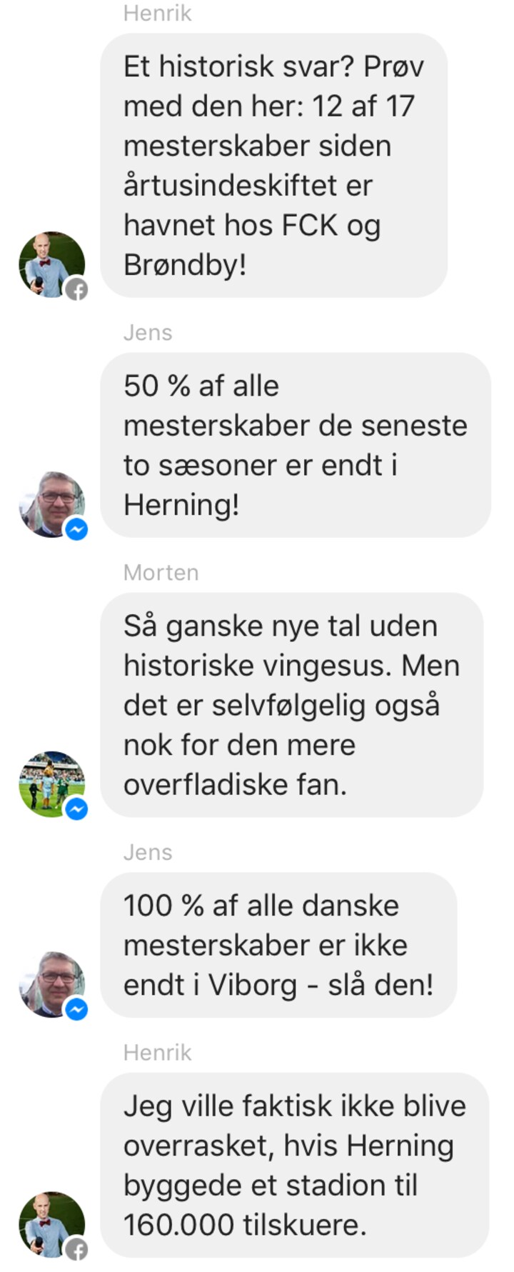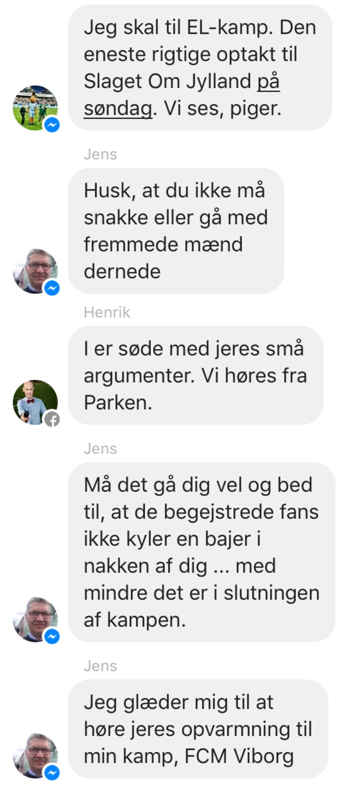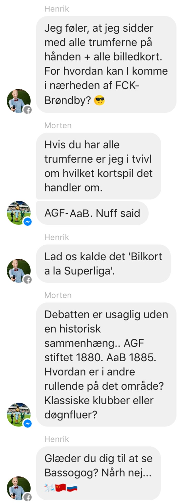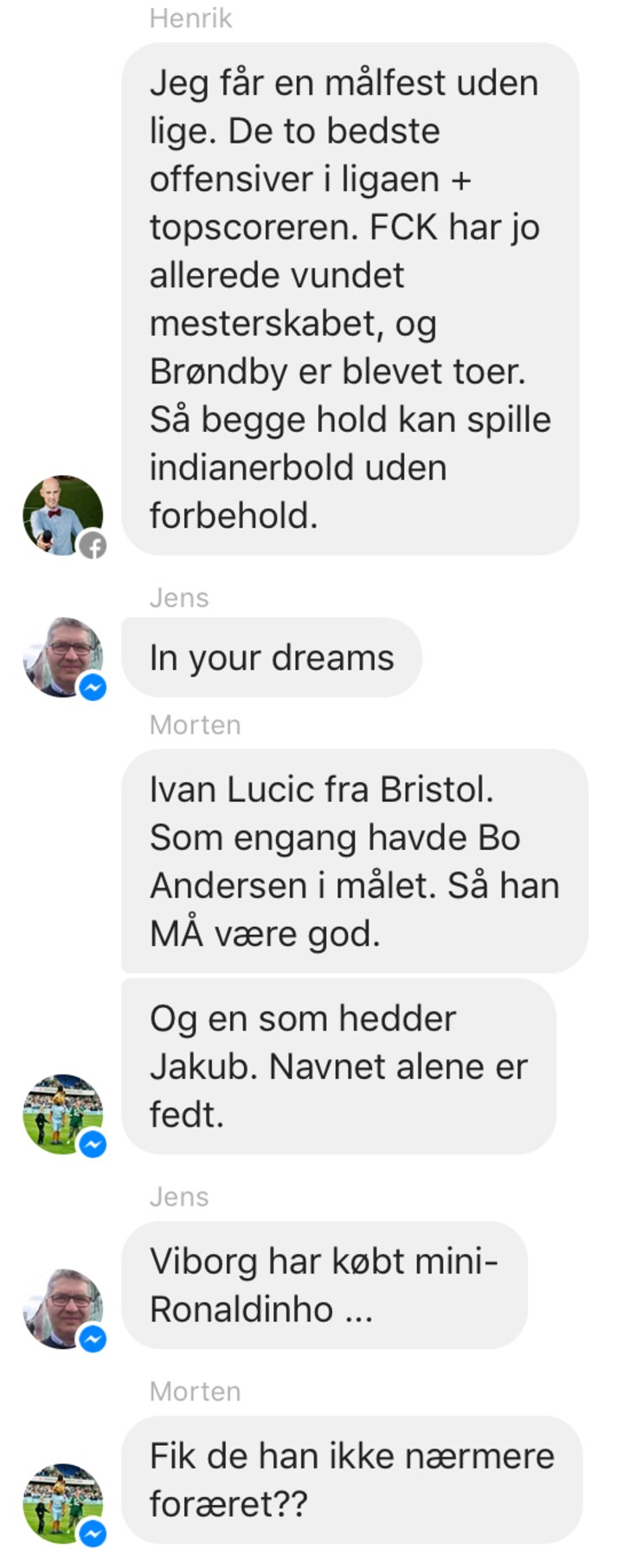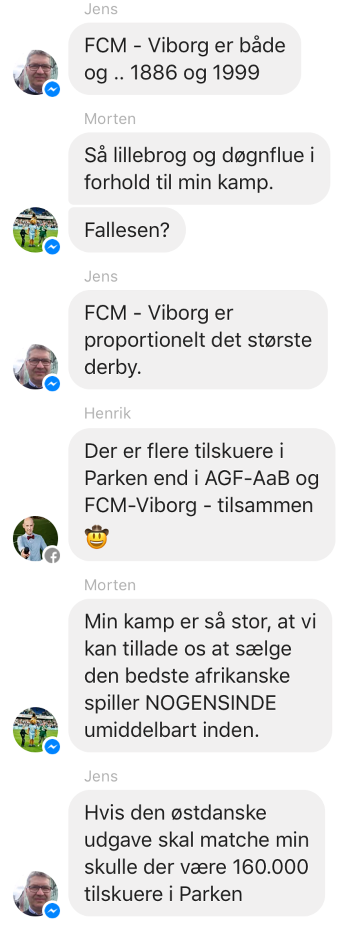 Men hvilket rivalopgør er egentlig den fedeste? DR Sportens tre kommentatorer til kampene i Liga på P3; Henrik Fallesen (FCK-Brøndby), Morten Hausborg (AGF-AaB) og Jens Ole Sørensen (FCM-Viborg) har i ugens løb haft en heftig intern chat-debat - og den kan du få lov til at læse med i her.