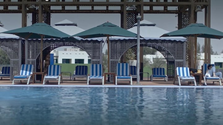 Her skal spillerne og resten af holdet bo på et hotel, der ligger cirka tre kvarters kørsel fra hovedstaden Doha. Hotellet har blandt andet en lang pool, der snor sig i en park.