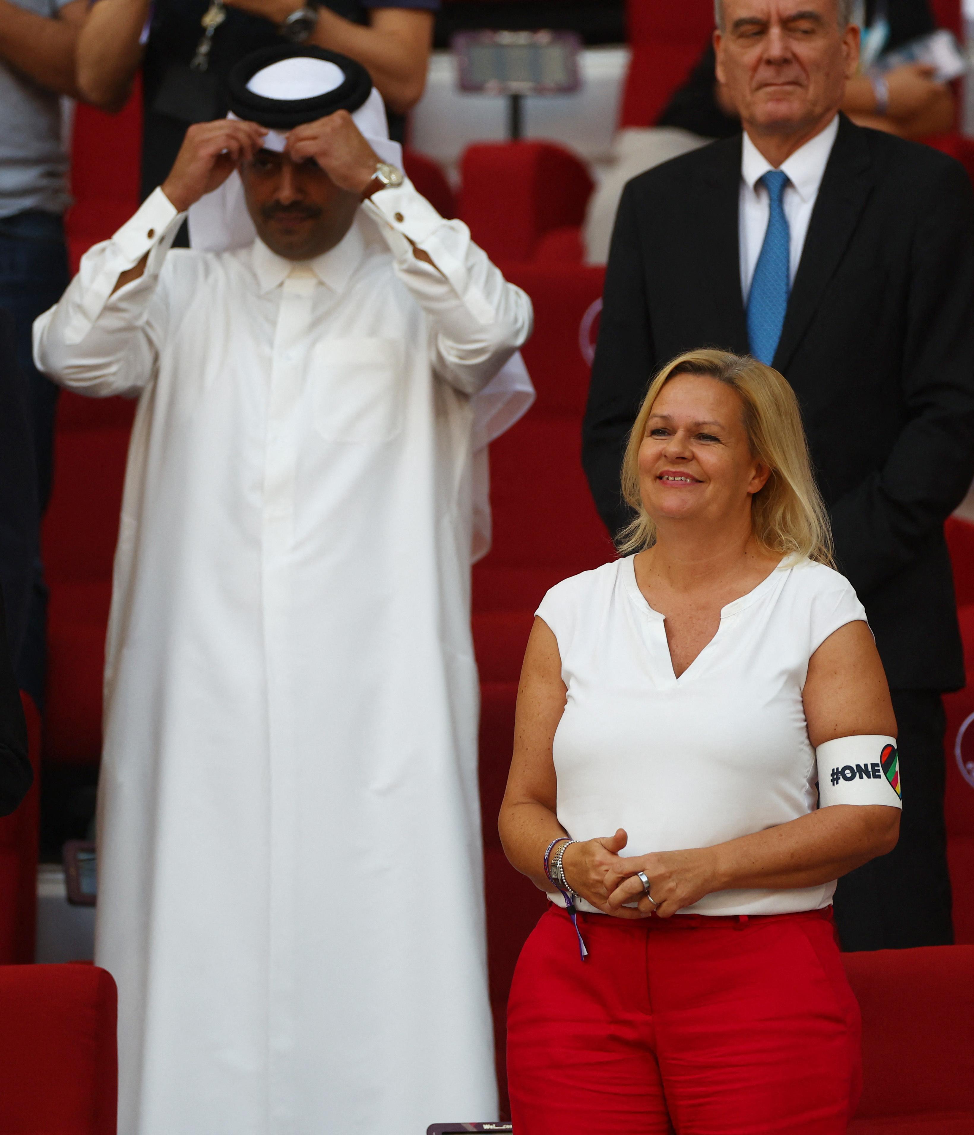 Det har dog ikke umiddelbart bekymret Tysklands indenrigsminister, Nancy Faeser. Hun overværede i hvert fald Tysklands kamp mod Japan onsdag med det omdiskuterede 'One Love'-armbind på sin venstre overarm. Den samme type armbind, som Fifa har forbudt spillerne at bære.