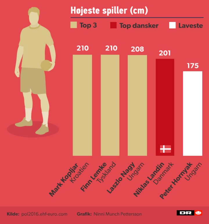 Danske mænd er nummer tre på listen over de højeste folkefærd i verden. Det afspejler sig dog ikke ligefrem af grafikken, der viser, at vores tyske broderfolk har fundet en EM-trup frem, der er en tommelfinger højere end den danske. De danske håndboldherrer er dog væsentligt højere end den gennemsnitlige danske mand, der måler 180,6 centimeter.
