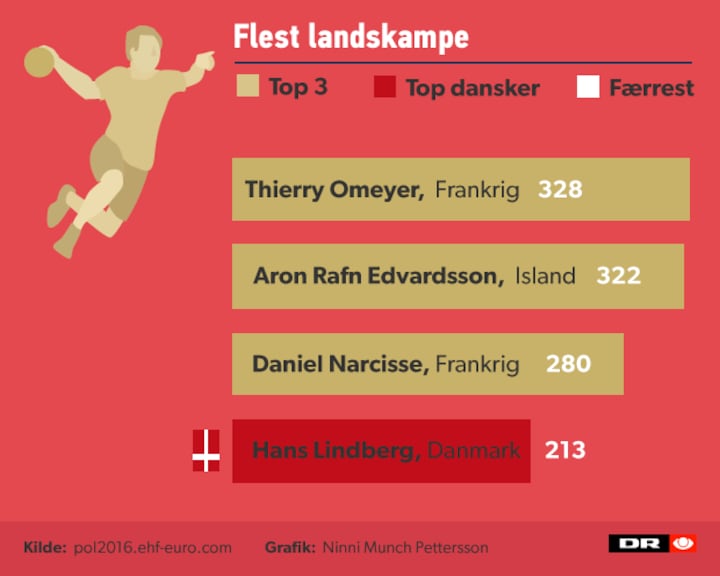Det er efterhånden gået 17 år siden, at den franske målmandslegende Thierry Omeyer for første gang stod i den franske landholdstrøje og sang med på Marseillaisen. I dag kan han nok teksten udenad, da han har spillet imponerende 327 landskampe for Frankrig. 39-årige Omeyer har dog stadig et stykke op til den mand, der har spillet flest landskampe nogensinde. Franske Jackson Richardson nåede nemlig at spille 417 landskampe.