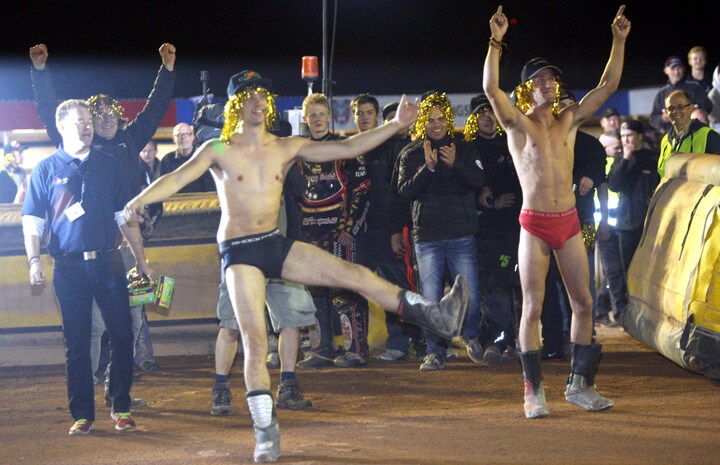 Men hvordan finder man på at køre en sejrsrunde iført intet andet end underhyler? Ja, hvor vildt det end lyder, så er det faktisk ikke første gang Thomsen har fejret en speedwaytriumf på den måde.