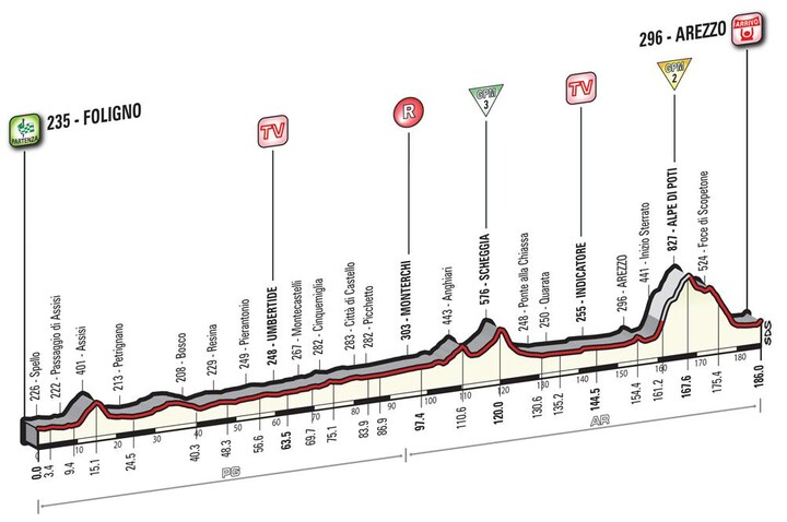 I dag skal rytterne ud på 186 kilometer halvkuperet terræn midt på den italienske støvle. Højdepunktet er en kategori 2-stigning knap 20 kilometer før mål med navnet Alpe di Poti. Det særlige ved den stigning er, at rytterne skal ud på en grusvej på vej mod toppen.