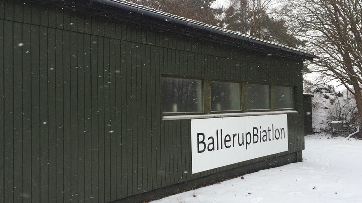Et skilt på den sneomkransede grønne skydeklub fortæller, at der også er andre brugere af lokalerne: BallerupBiatlon står der nemlig skrevet med store sorte typer på en hvid plade.