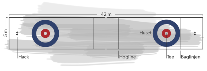 Banen er 42 meter lang og 5 meter bred. I hver ende er et målområde, der kaldes ”huset” malet på isen med et midtpunkt kaldet ”tee”. Stenen spilles fra et afsæt, ”hack”, bag huset ned ad banen til huset i den anden ende. For at stenen tæller med i spil, skal den standse mellem ”hogline” og baglinjen.