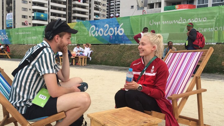 Vi giver hinanden hånden, og hun sætter sig over i en strandstol ti meter fra vores lille ydmyge bænk. Her sidder en af mine kollegaer klar med sit sendeudstyr, så han kan have den sympatiske 19-årige komet direkte med i radioen i programmet OL på P3.