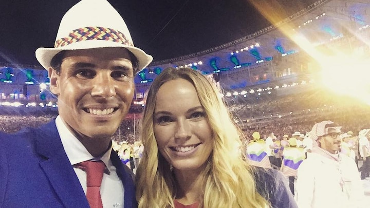 Caroline Wozniacki, der bar til danske fane til åbningen, poserer her sammen med tenniskollegaen Rafael Nadal, som fik æren af at bære det spanske flag for sit hjemland.