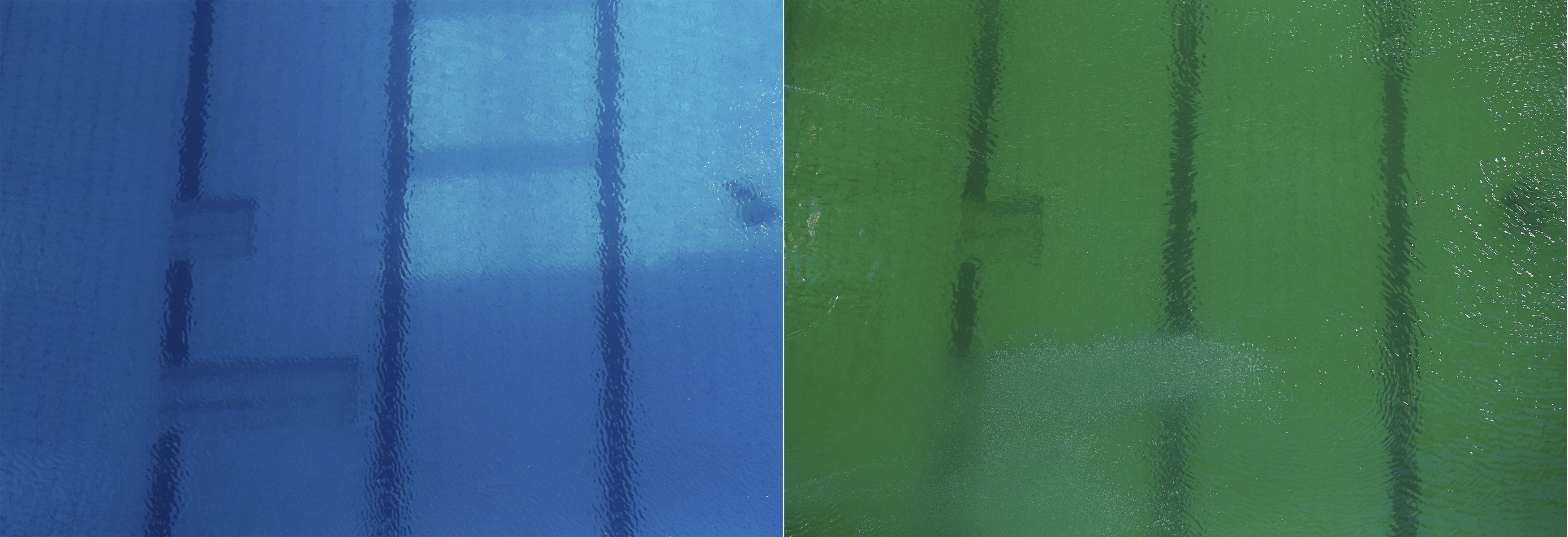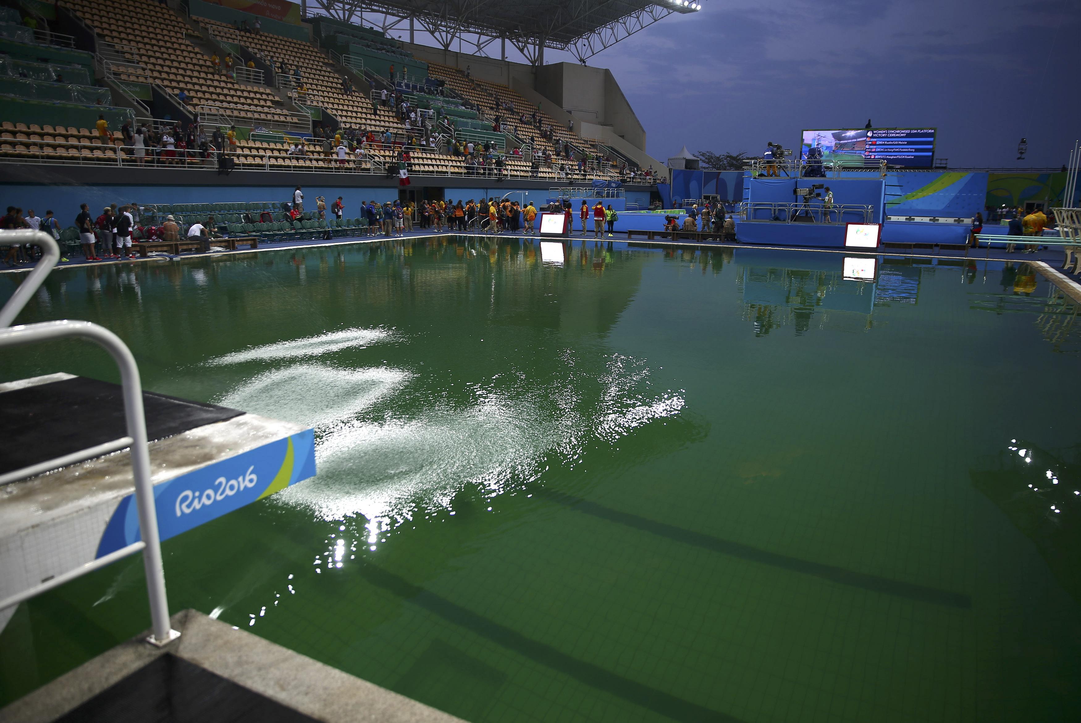Men natten til onsdag dansk tid, da kvindernes 10-meter-konkurrence blev afviklet, var farven nærmere grumset grøn. I hvert fald så grumset, så bunden ikke længere var synlig. På tv-billeder lignede det mere en mergelgrav, som kvinderne sprang i, end en diamantklar OL-pool.