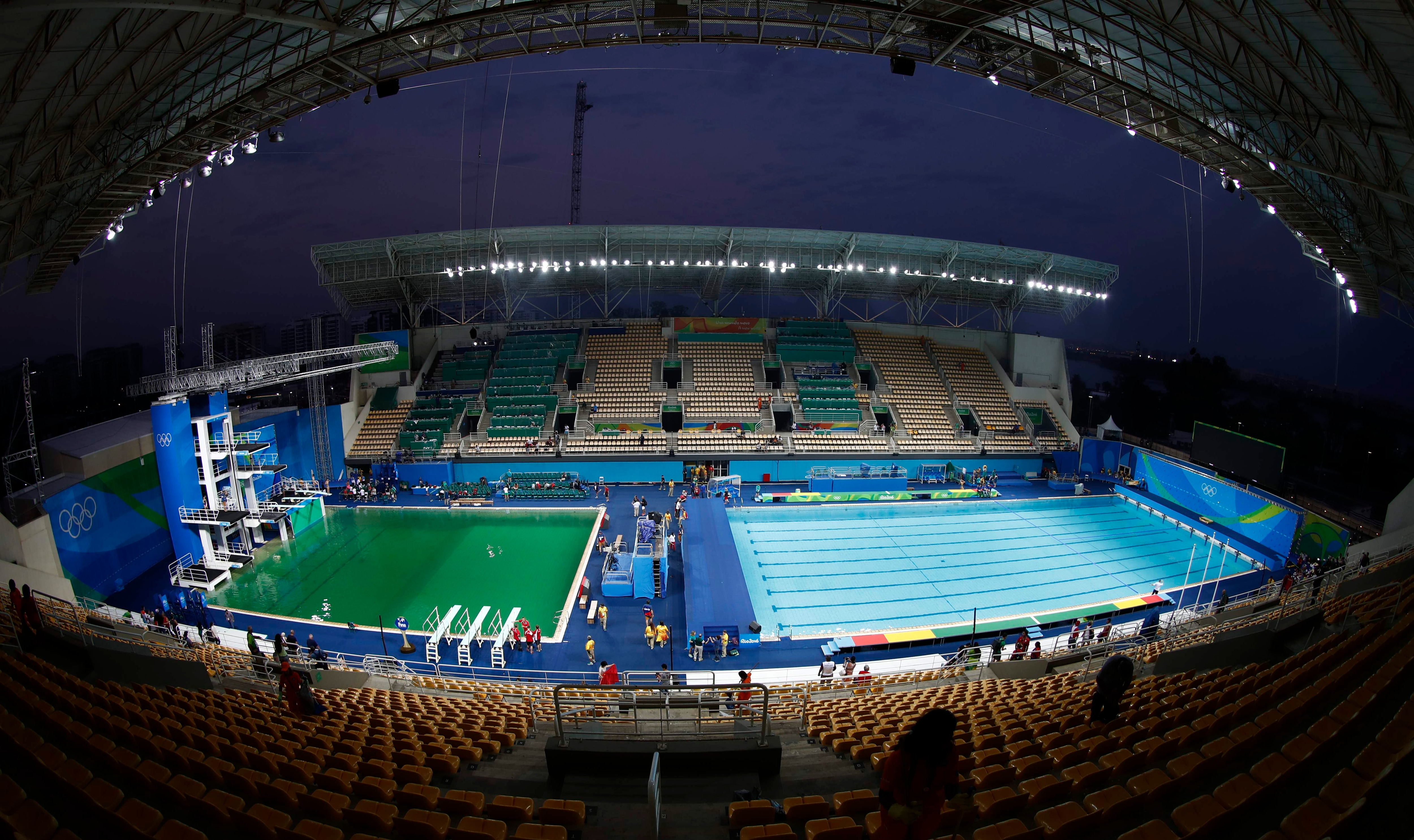 Nej, det er såmænd farven på vandet. I det olympiske udspringsbassin i Maria Lenk Aquatics Centre i Rio.