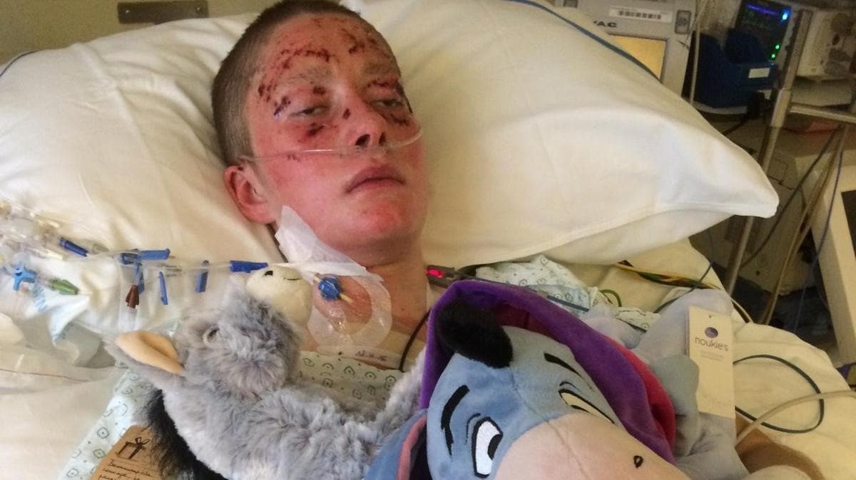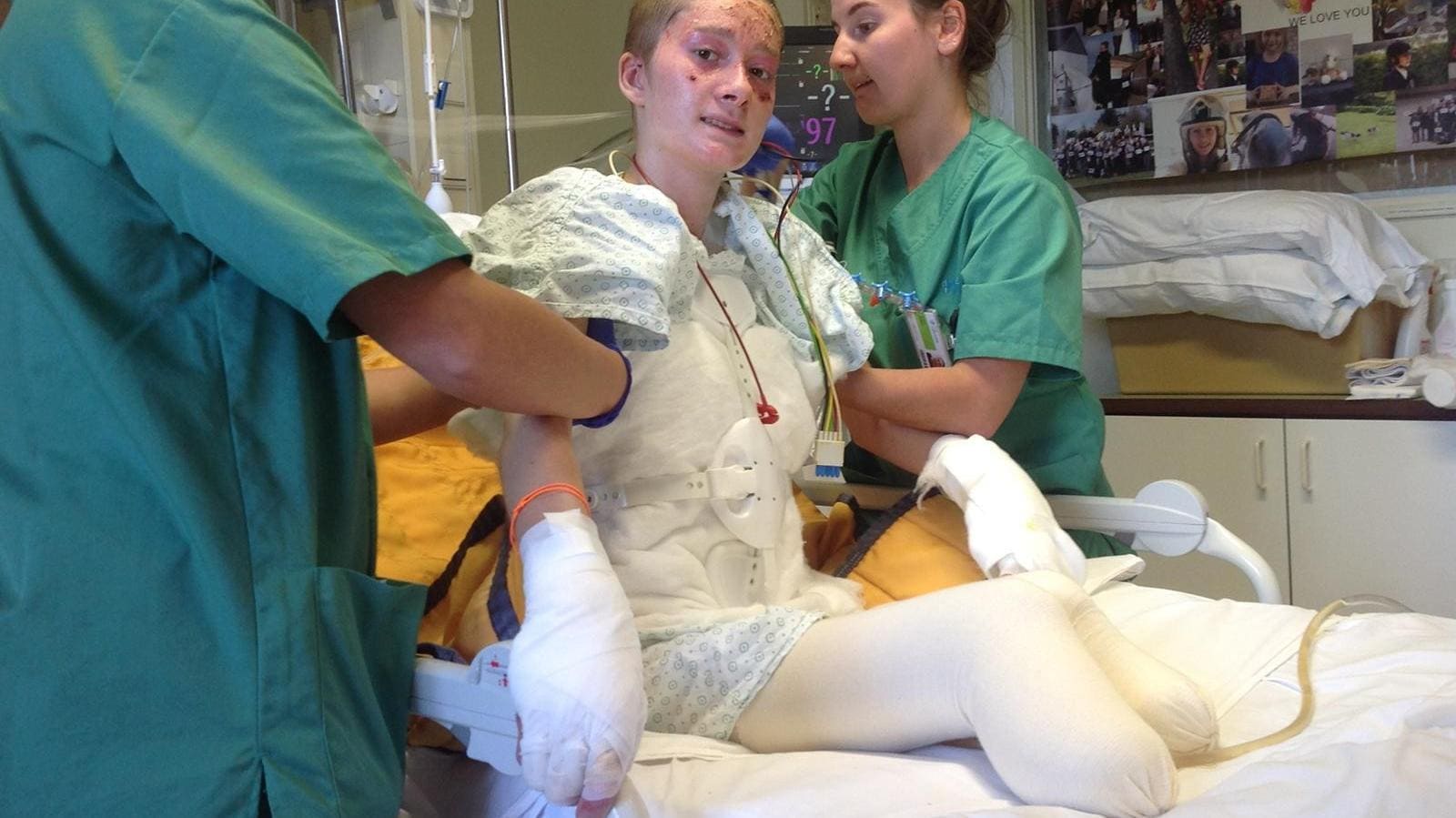 Hun har fået anden- og tredjegradsforbrændinger på en tredjedel af kroppen, mens hendes underben, ankler og fødder nærmest er blevet pulveriseret, og blodet sprøjter ud af de overrevne pulsårer.