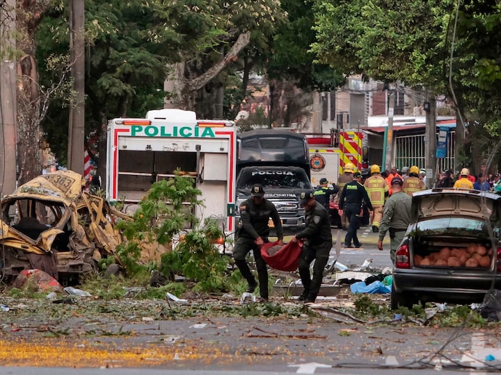 TOPSHOT - Police officers carry debris from the site of a bomb explosion in Cali, Colombia on August 21 2025. Five people were killed and dozens were injured when a vehicle bomb targeted a military base on a busy street in the Colombian city of Cali on August 21, 2025, local authorities said. (Photo by Iusef Samir Rojas / AFP) (Foto: © Iusef Samir Rojas, AFP/Ritzau Scanpix)