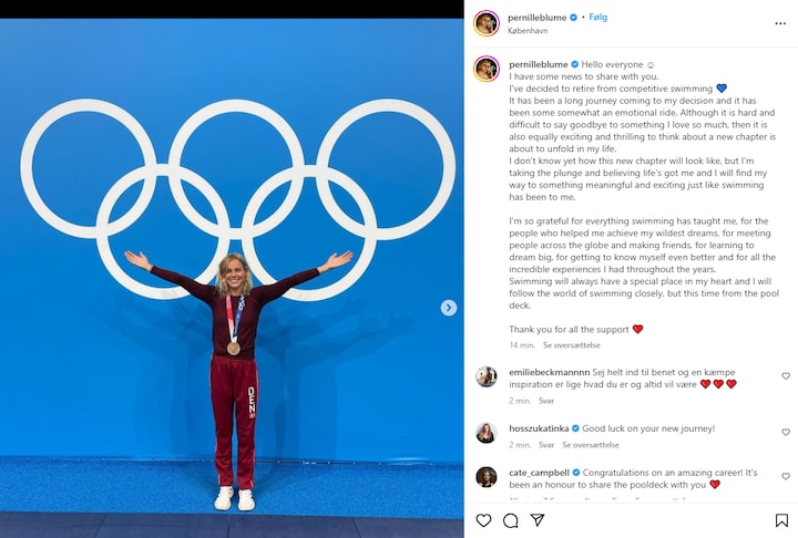 - Jeg er så taknemmelig for alt, svømning har lært mig. For de mennesker, der hjalp mig med at nå mine vildeste drømme, for at møde mennesker over hele kloden og få venner, for at lære at drømme stort, for at lære mig selv endnu bedre at kende og for alle de utrolige oplevelser, jeg har haft gennem årene, skriver Pernille Blume.
