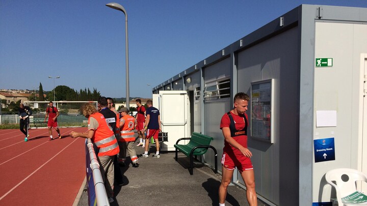 Hvide containere med bolde og udstyr larmer visuelt på den ene side ved banen, hvor også et telt med motionscykler er opstillet. En række sammenhængende skure skal gøre det ud for omklædningsrum for spillerne, hvis forhold uden sammenligning er de dårligste af de EM-baser, DR har besøgt ved dette EM.