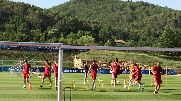 I modsætning til eksempelvis en træningssession hos Spanien, som kun træner med bold, veksler Ungarns træning mellem en smule boldtræning og så en del fysiske øvelser med løb forbi toppe og gennem opstillede stænger.