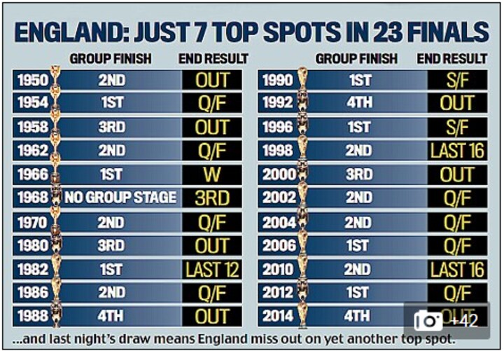 Ved VM i 2014 røg England ud allerede i gruppespillet, og den ellers så stolte fodboldnation er ikke nået længere end til kvartfinalen ved en slutrunde siden EM på hjemmebane i 1996, hvor de tabte til Tyskland efter straffesparkskonkurrence.