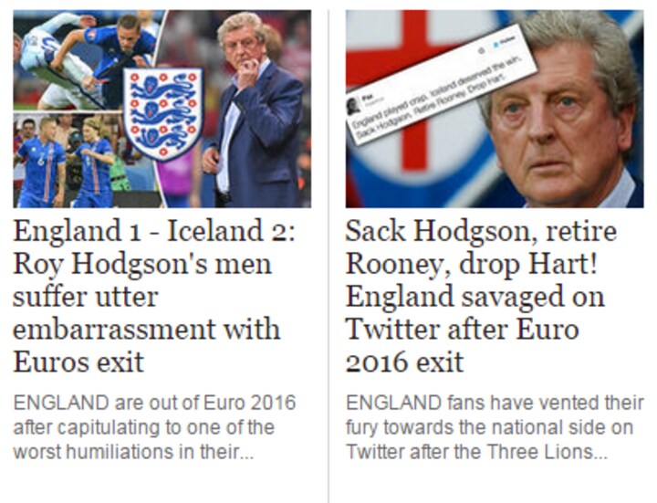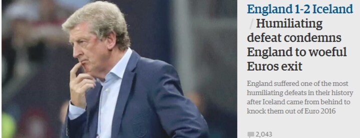 The Express skriver, at Roy Hodgson og England led et 'gennemført ydmygende exit fra EM' og samler samtidig lidt op på reaktioner fra Twitter. Formentlig ikke læsning, som Roy Hodgson har lyst til at hygge sig med over morgenkaffen tirsdag morgen.