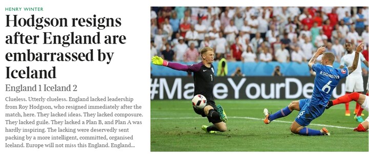 Fuldstændig uden hoved og hale. England manglede lederskab fra Roy Hodgson, som sagde op lige efter kampen. De manglede ideer. De manglede fatning, de manglede omtanke. De manglede en Plan B, og Plan A var heller ikke inspirerende. De blev fortjent sent hjem og pakke af et mere intelligent, engageret og organiseret Island. Europa kommer ikke til at savne dette England.