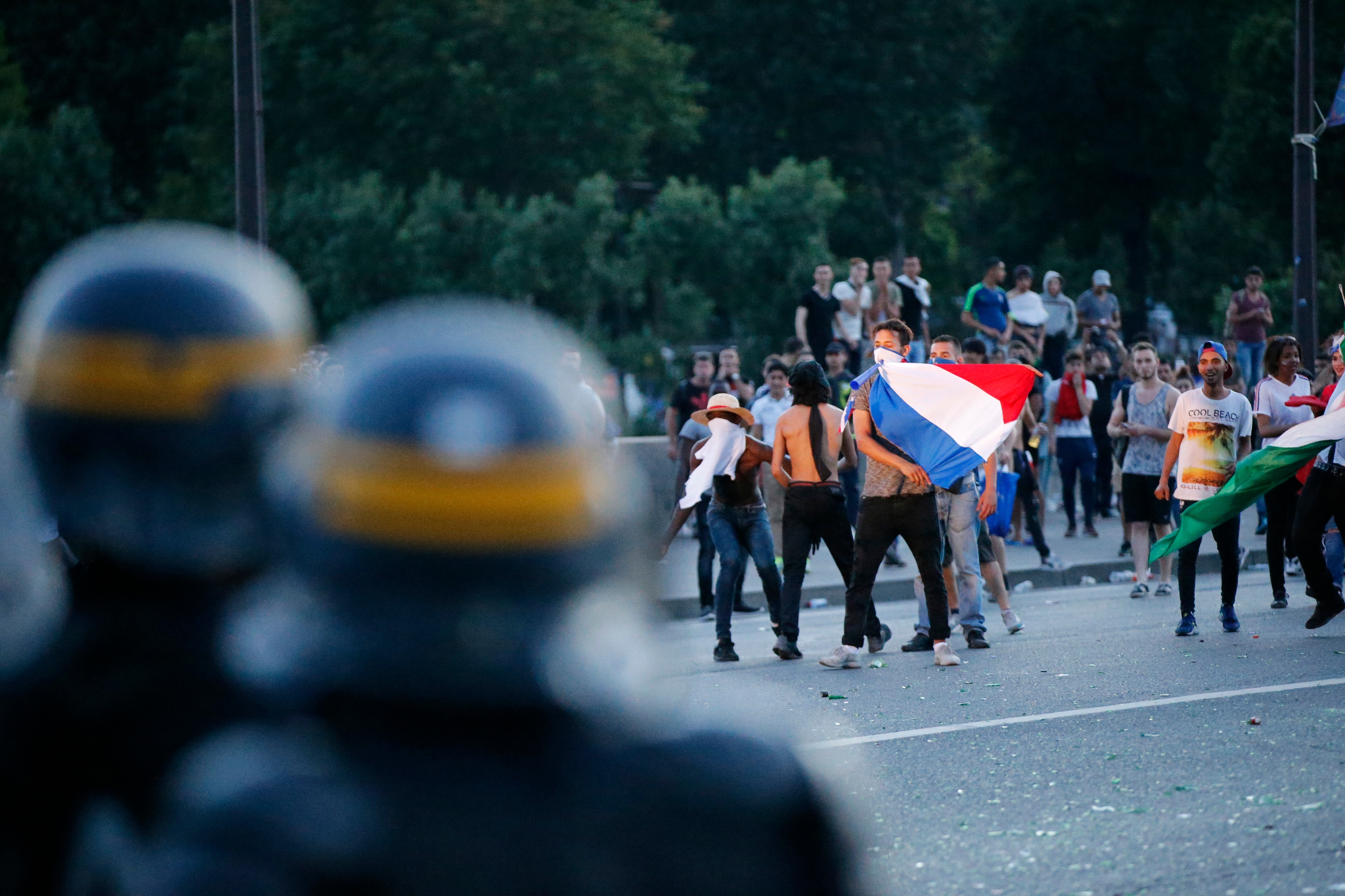 Det franske politi står klar med knipler, skjolde og vandkanoner for at forhindre, at situationen eskalerer yderligere.