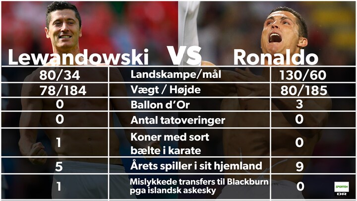 To navne skiller sig ud, når Polen og Portugal torsdag aften spiller den første af kvartfinalerne ved EM i Frankrig. Robert Lewandowski og Cristiano Ronaldo er ubestridt de to landes største stjerner, og DR Sporten har kigget lidt nærmere på nogle fakta om de to angribere.
