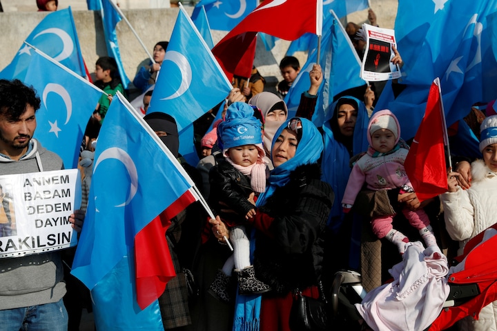 Protesterne lød blandt andet på, at Kina aldrig skulle være tildelt værtskabet på grund af behandlingen af landets muslimske mindretal, uighurere.