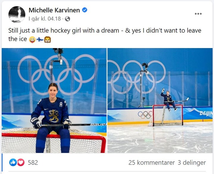Michelle Karvinen lavede torsdag et opslag på sin Facebook-side med to billeder af sig selv siddende på et hockeymål og teksten "Still just a little hockey girl with a dream".