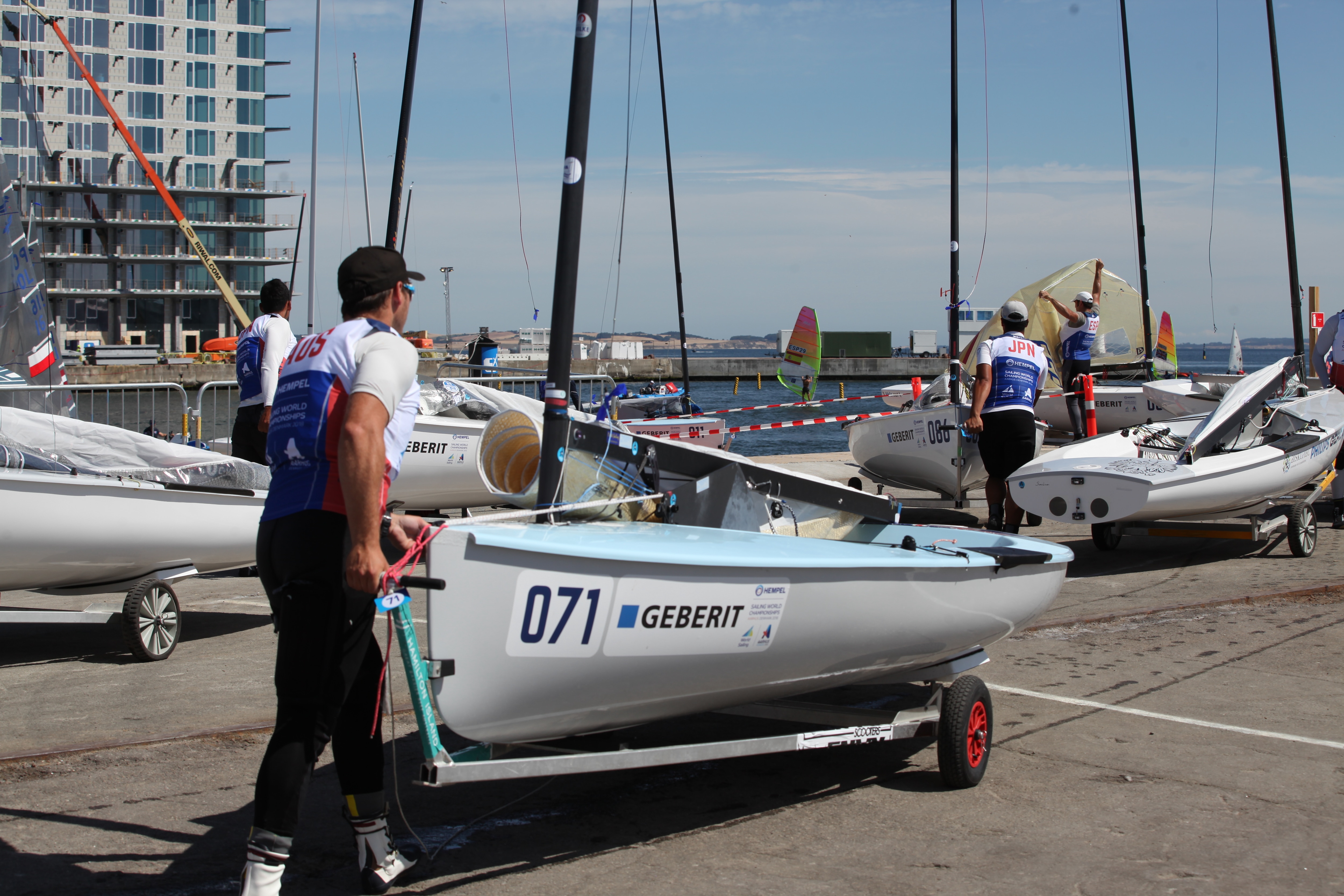 Kvart i to sker der endelig noget. Sejlerne på Boat Park 3 flyver op fra deres stole og maser nærmest for at komme i vandet. Vinden er vendt, og nu skal VM i gang.