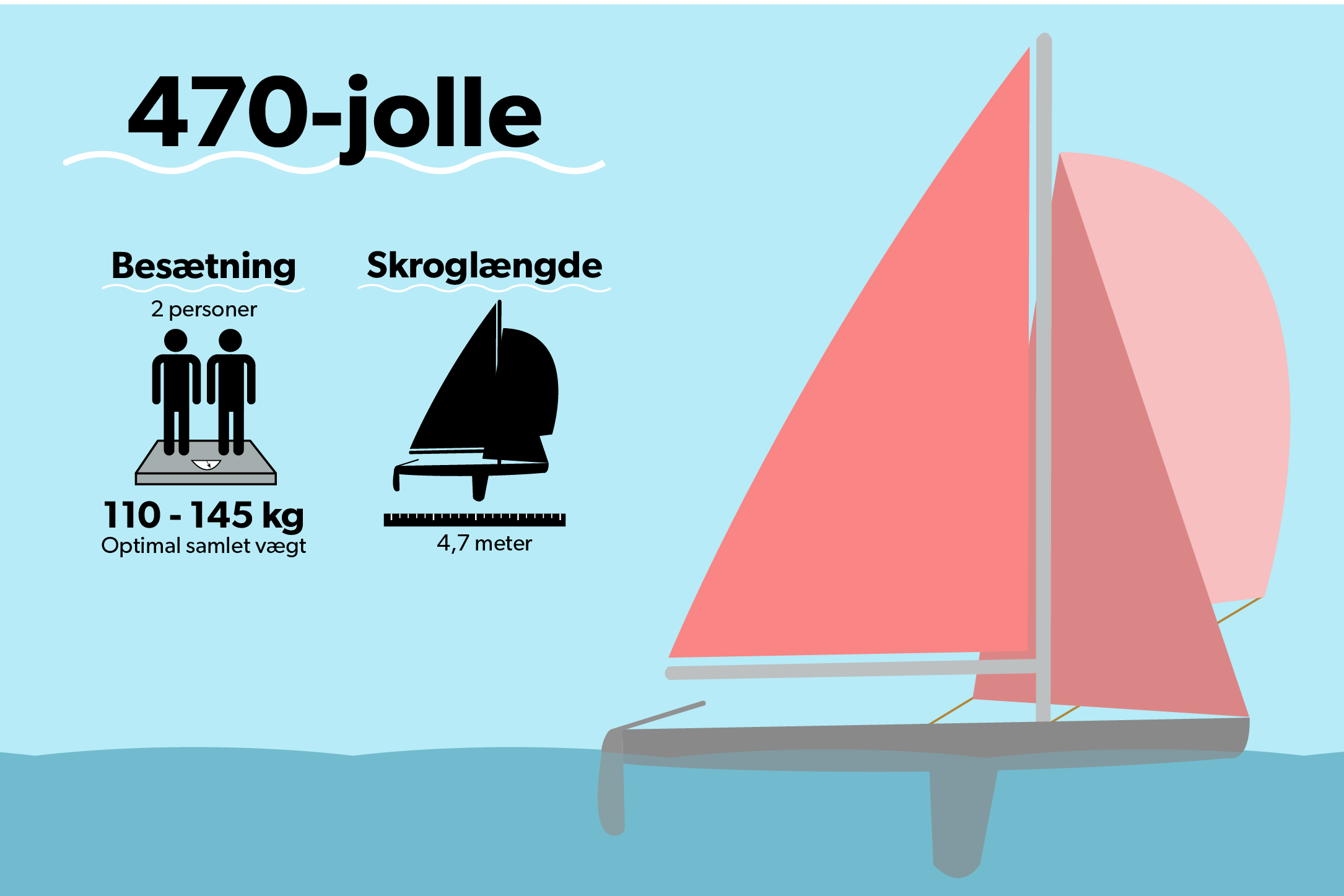 Som det også er tilfældet med 49eren, så har 470-jollen sit navn grundet sin skroglængde. Jollen er 470 centimeter lang. 470-jollen sejles af to relativt lette personer, og besætningens samlede optimal vægt ligger på 110-145 kg. Fun fact: Danmark har tidligere vundet VM-guld i denne bådtype. Dette skete tilbage i 1973 af Henrik Søderlund og Anders Børresen.