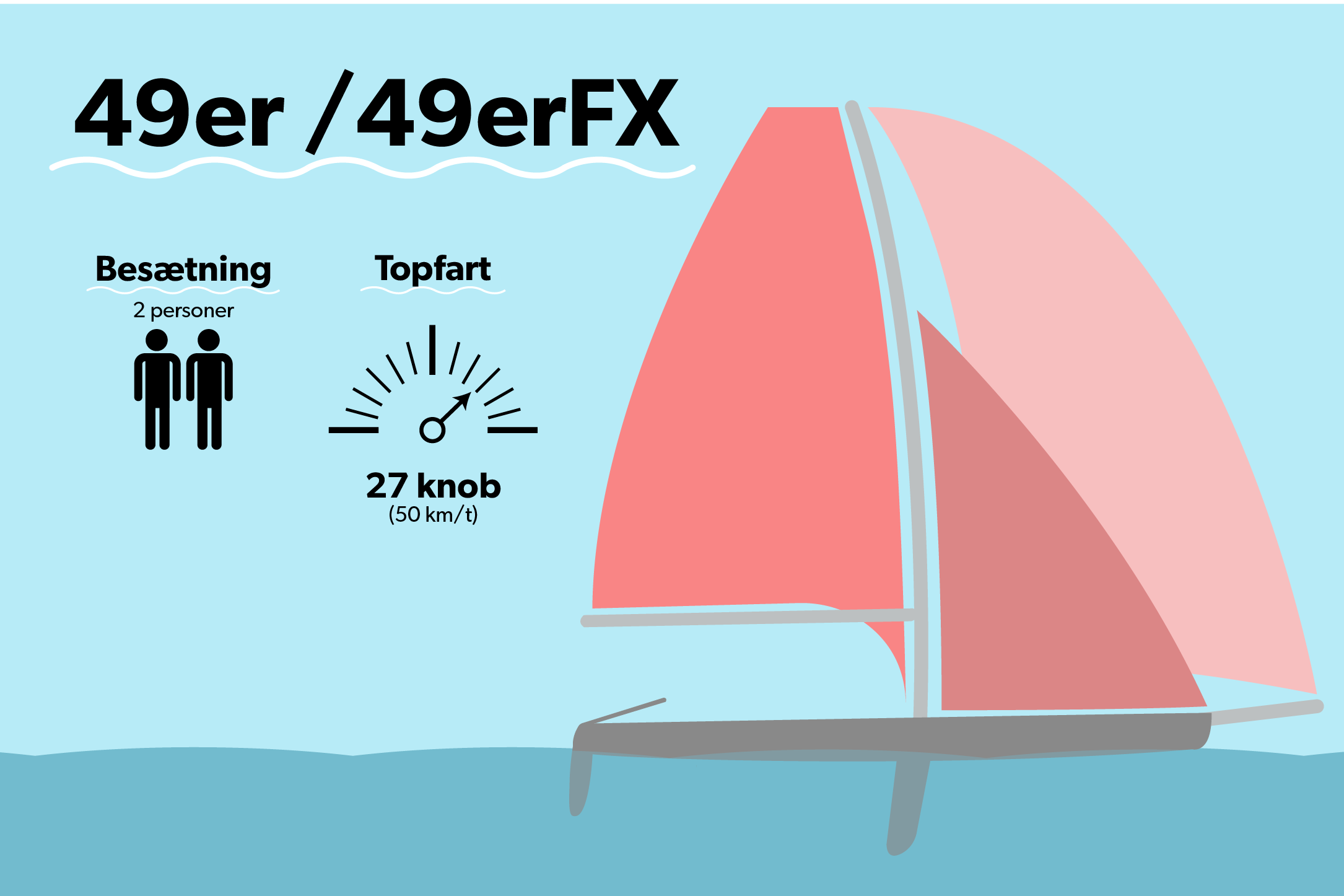 Hvis du kan lide fart, så er 49eren noget for dig. Med en besætning på to personer og tre sejl, der kan spændes for, kan 49eren nå op på hele 50 kilometer i timen. 49eren har sit navn, grundet sin skroglængde på 4,9 meter. Under VM er der også en kvindeklasse (49erFX), hvor skroget er magen til 49eren, men 49erFX har lidt mindre sejl.