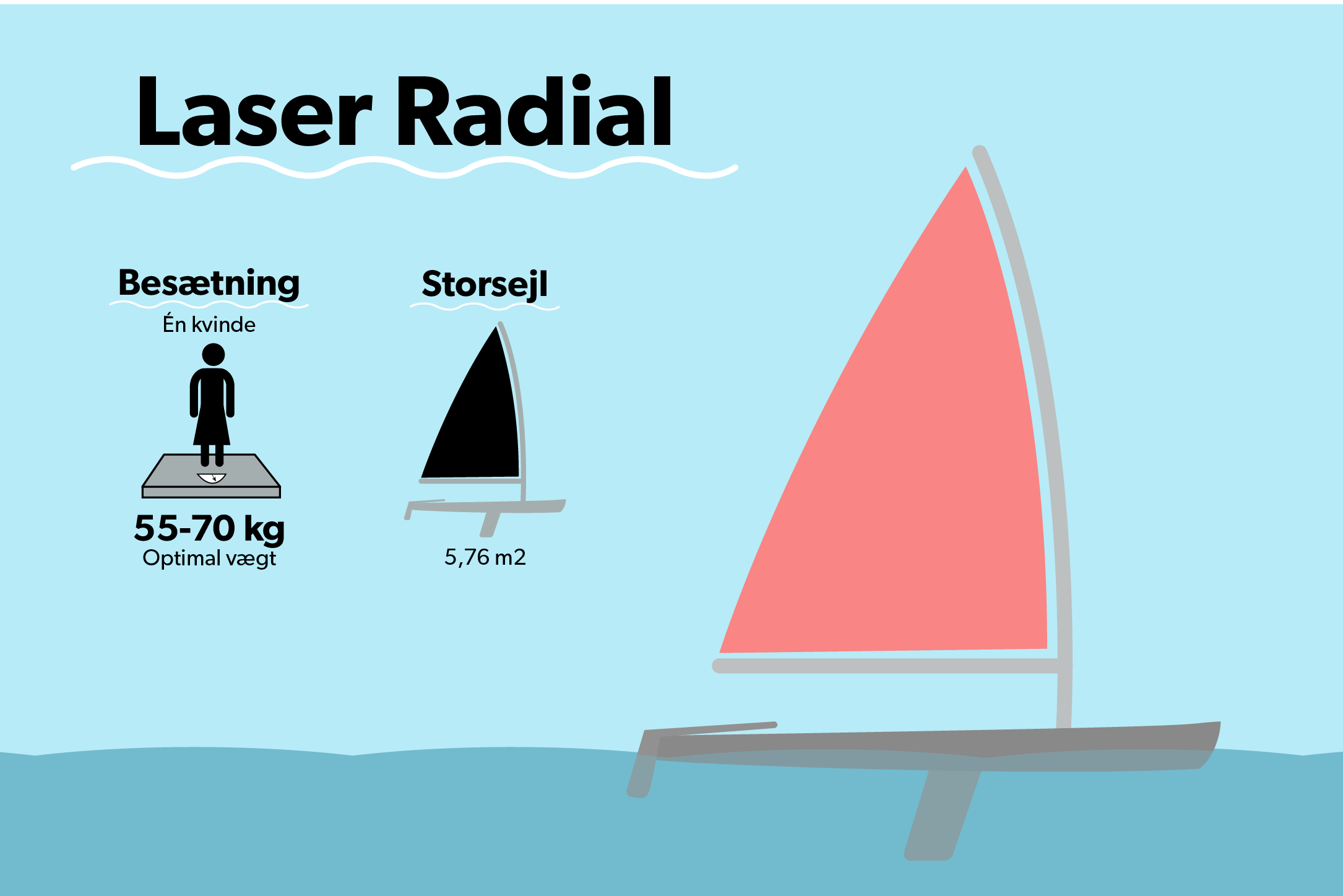 Laser Radial er kvindeklassen indenfor Laser. Skroget er derfor identisk med Laser Standard, men sejlet er mindre. Sejlerens optimal vægt i Laser Radial ligger også lidt lavere end ved sejleren i Laser Standard. Fun fact: Blandt deltagerne i VM 2018, stiller Anne-Marie Rindom op. I hendes trofæskab hænger blandt andet én guldmedalje fra VM 2015.