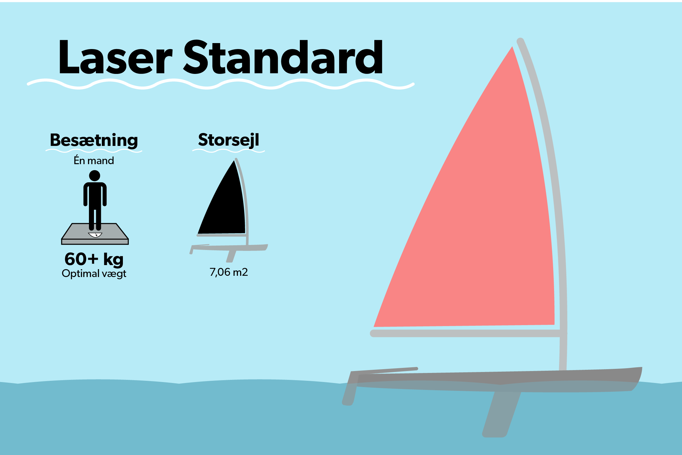 Laser Standard er en én-mandsjolle med et enkelt sejl, som bedst sejles af en person med en vægt på over 60 kilo. Personens vægt spiller ind i forhold til vinden, da en person med en højere vægt, vil have nemmere ved at sejle i hård vind. Fun fact: Laser er en af de mest udbredte jolleklasser på verdensplan, og derfor er der også samlet en masse laser-joller til dette års VM.