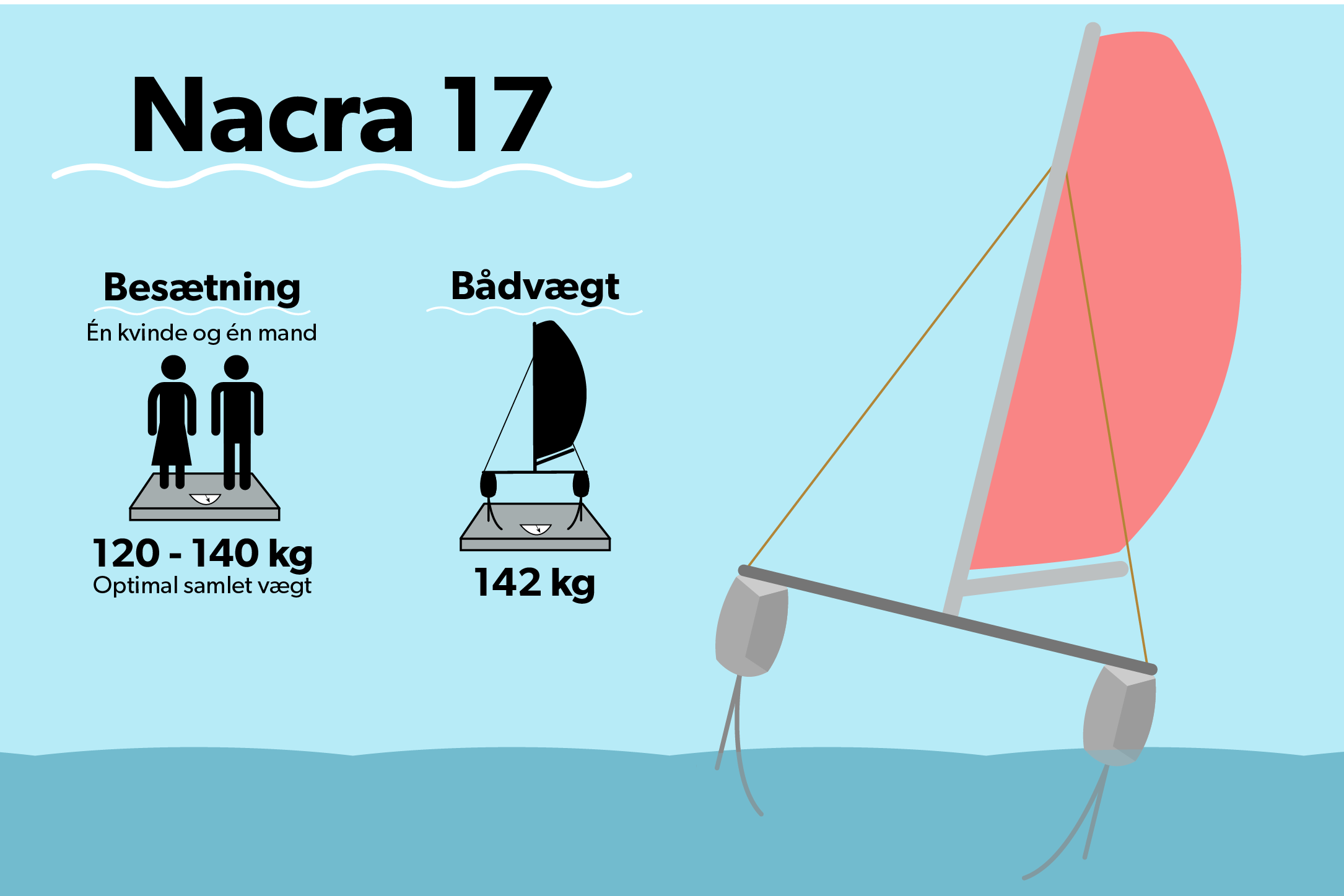 Nacra 17 adskiller sig fra de andre bådtyper ved at være en katamaran-båd. Det vil sige, at båden har to skrog, som er forbundet af en flad platform med sejlene i midten. Nacra 17 er bygget til høj fart, og når den opnår høj fart, vil skrogene løfte sig fra vandet. Denne svævende effekt sker ved hjælp af skrogenes foils, som er de finne-lignende sværd som skrogene har monteret i bunden. Under VM skal der ombord på Nacra 17 befinde sig en kvinde og en mand. Fun fact: I VM-sammenhæng har Allan Nørregaard og Anette Viborg Andreasen skaffet Danmark en VM-sølvmedalje i 2016.